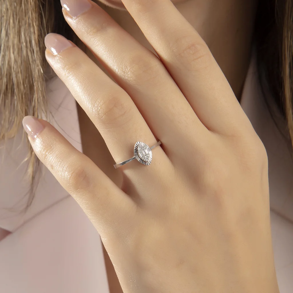 Bu zarif pırlanta yüzüğün büyüsüne kapılmaya hazır olun. Merkezinde birbirine mükemmel uyum içinde yan yana dizilmiş baget pırlantalar yer alırken, pırlantalar sadece ışıltılarıyla değil aynı zamanda birlikte yarattıkları harmonik uyumla da göz kamaştırıyor. Yüzüğün üzerindeki ve altındaki yuvarlak pırlantalar ise bu büyüleyici güzelliği adeta bir yıldızlar korusu gibi sürdürüyor. Yüzüğün en dıştaki altın bölümüne yapılan özel işlem ise bu parıltı şölenini daha da artırarak sizi adeta ışığın dansına davet ediyor.