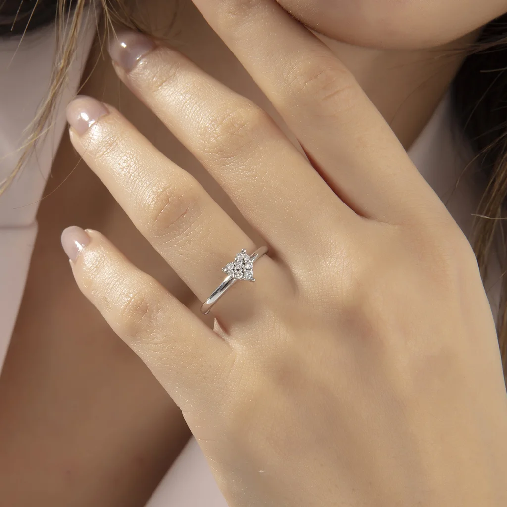 Bu zarif yüzük yedi adet özenle seçilmiş yuvarlak pırlantayla kalp şeklinde bir bütünlük oluşturuyor. Klasik bir tasarımın ötesinde aşkın ve romantizmin somut bir temsili olarak öne çıkıp, her bir pırlanta kendine özgü bir anlam ve derin bir yaşanmışlık taşıyor. Böylece sadece bir mücevher değil, aynı zamanda duygusal bir hikayenin de taşıyıcısı.