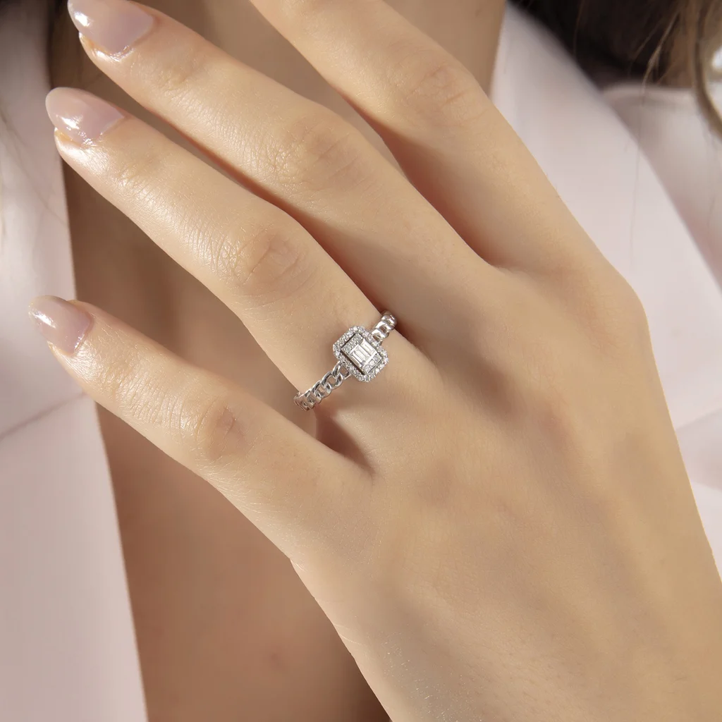 Bu özel tasarım baget yüzüğümüz hem klasik hem de modern zevkleri bir arada arayan kadınlar için ideal. Alışıla gelmişin ötesinde yenilikçi bir tarza sahip bu yüzük, ortadaki baget pırlantaların harmonik dizilimi ile klasik bir ışıltı sunarken, aynı zamanda modern dokunuşlarla göz dolduruyor. Yüzüğün kol kısmındaki zincir tasarımı, bağlılık ve güçlü bağların bir simgesi olarak dikkat çekiyor. Anlamı ve stili ön planda tutan kendine has bir tarz yaratmak isteyen kadınlar için bu yüzük sadece bir aksesuar olmanın ötesinde, kişisel bir ifade biçimi sunuyor. Bu eşsiz parça ile tarzınızı farklılaştırırken taşıdığı anlamın derinliğini de hissedeceksiniz.