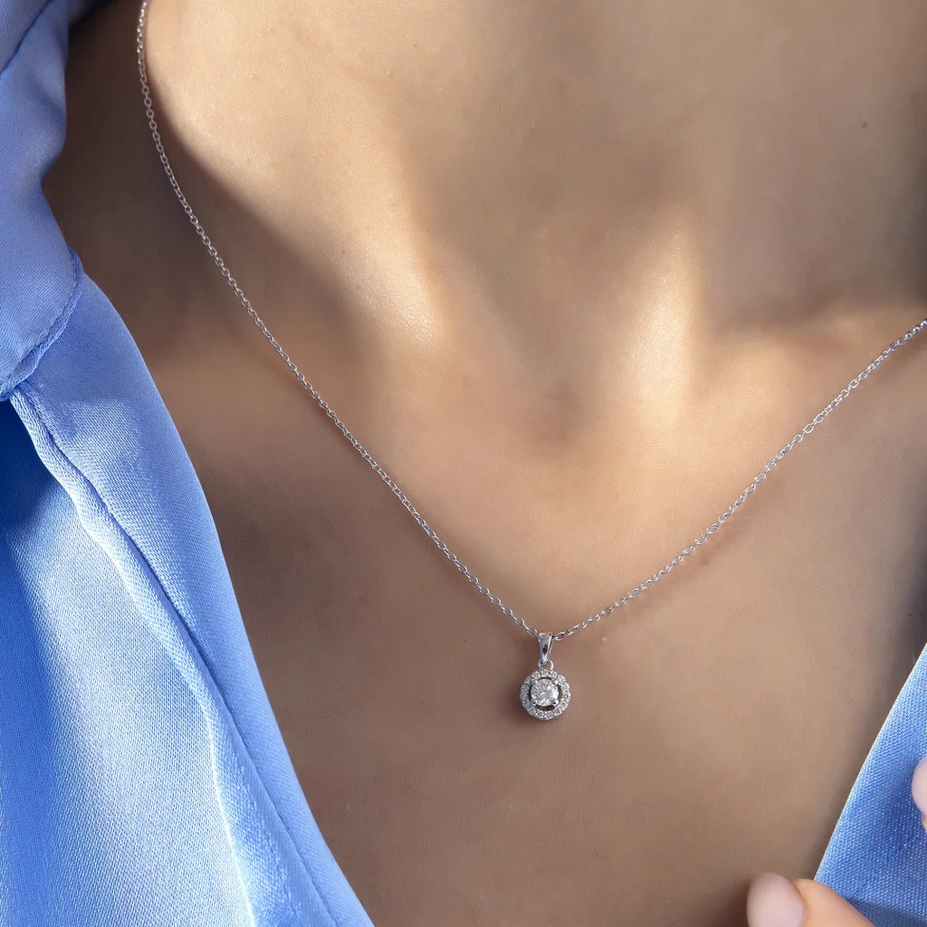 Eşsiz bir parıltının ve zarafetin buluşma noktasında yeni bir keşfe hazır olun. Kolyemiz muhteşem tek parça pırlanta ile ortaya çıkan ışıltısını etrafını saran tek sıra pırlantalar ile taçlandırarak sizlere sunuyor.