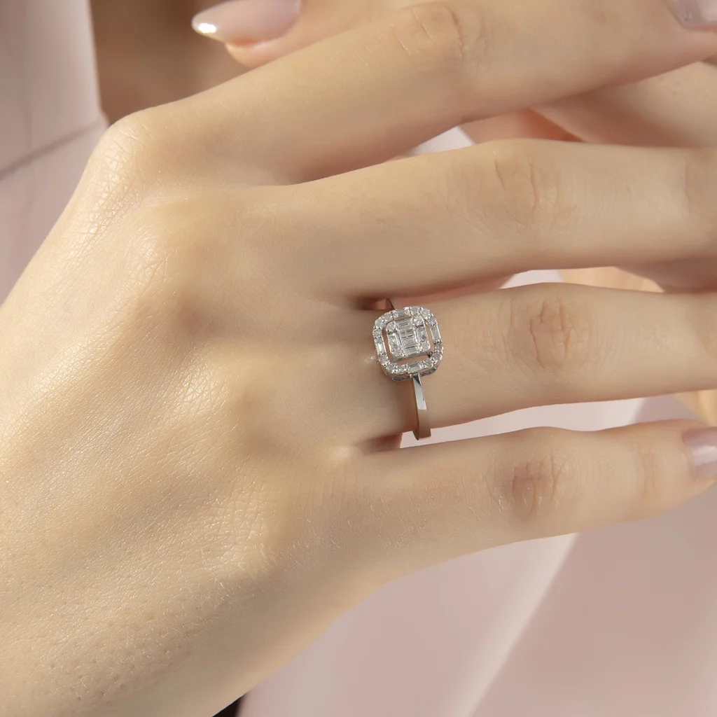 Sıradanlıktan uzak cesur ve yenilikçi bir tasarıma sahip olan bu mücevher, pırlanta severler için adeta bir sanat eseri niteliğinde. Yüzüğün merkezinde yer alan özenle seçilmiş baget pırlantalar bu benzersiz tasarımın kalbini oluşturuyor. Her biri ışığın en mükemmel şekilde yansımasını sağlayarak, göz kamaştırıcı bir ışıltıyı ortaya çıkarıyor.