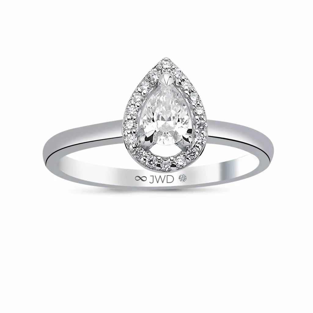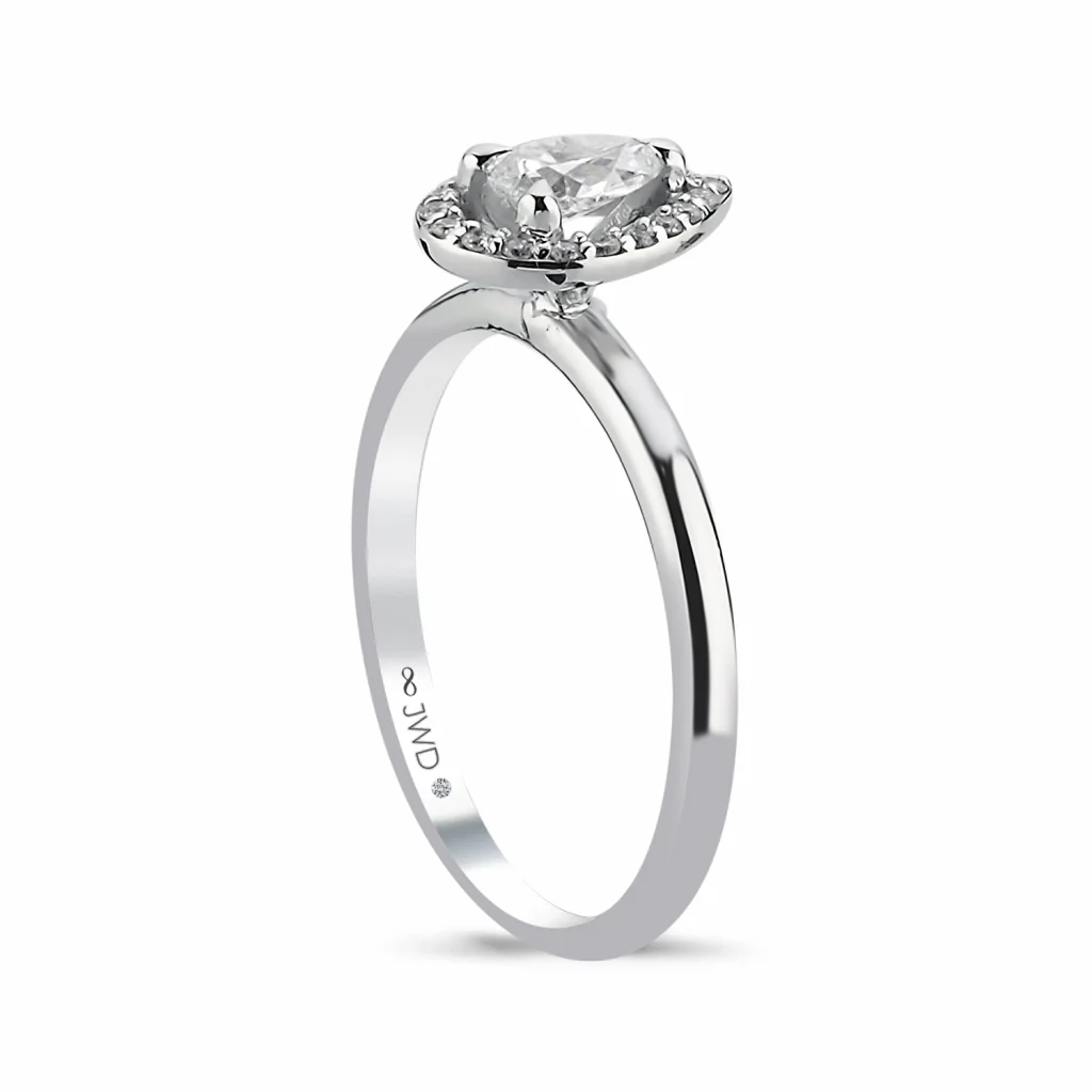 Bu benzersiz yüzük merkezindeki göz alıcı damla pırlanta ile ışıltısını taçlandırıyor. Damla pırlantanın etrafını saran round pırlantalar, zarafetini ve güzelliğini vurgularken, yüzüğün kolundaki estetik ise merkezdeki ışıltının yanlara doğru zarif bir şekilde devam etmesini sağlıyor.
