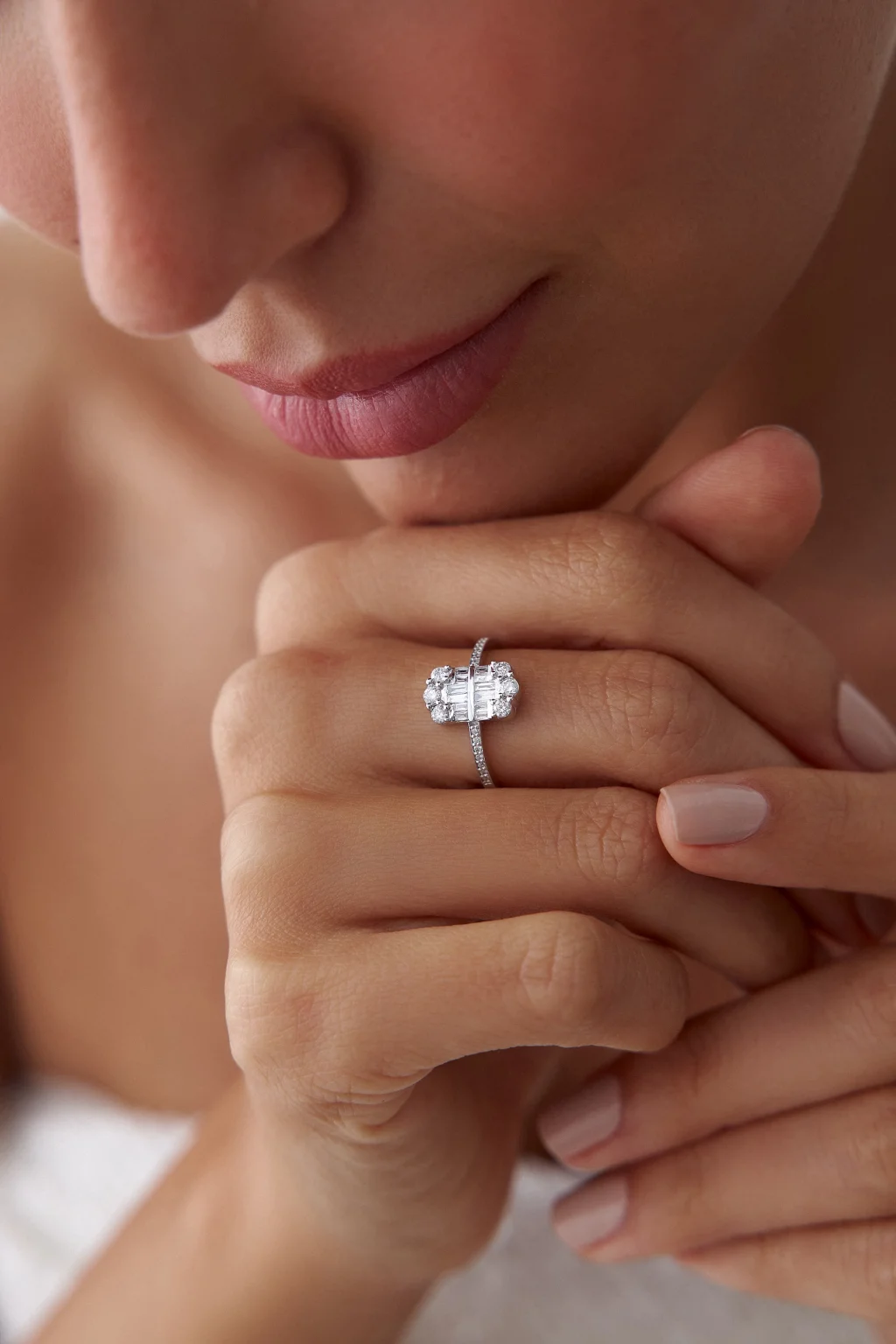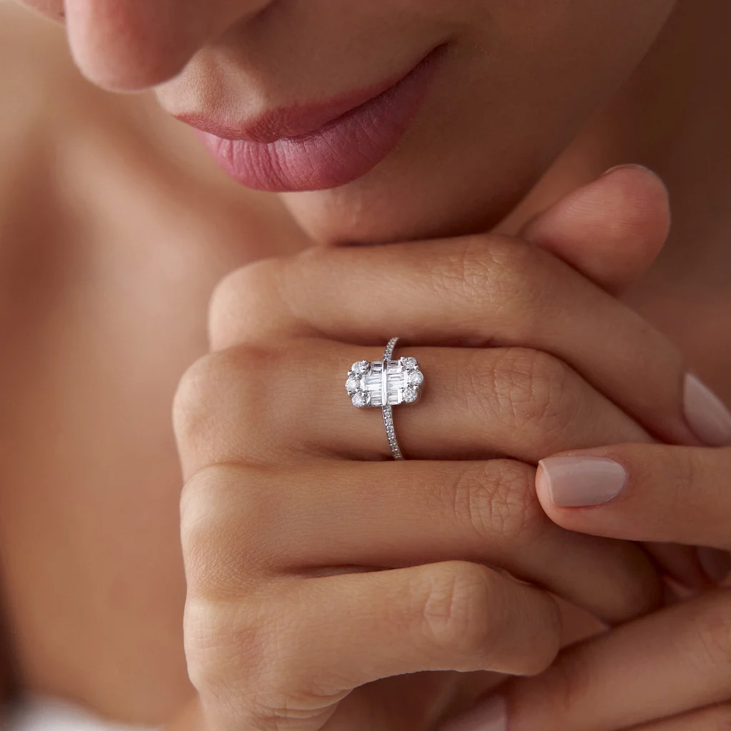 Baget ve round pırlantalar bu modern yüzüğü oluşturuyor. Minimalist şıklık ve zarafetin mükemmel kombinasyonu.