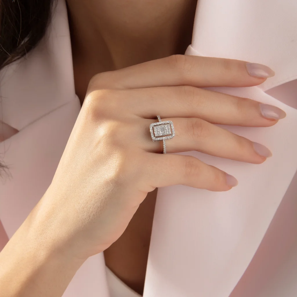 Yüzüğün üst ve alt kısmında ikişer sıra halinde dizilmiş round pırlantalar ise bu eşsiz tasarımın gösterişini artırıyor. Her biri incelikle yerleştirilmiş bu pırlantalar baget pırlantaların zarafetiyle mükemmel bir uyum içinde. Yüzüğün dış çerçevesinde ve kolundaki round pırlantalar ise bu zarif kompozisyonun son dokunuşunu oluşturuyor.