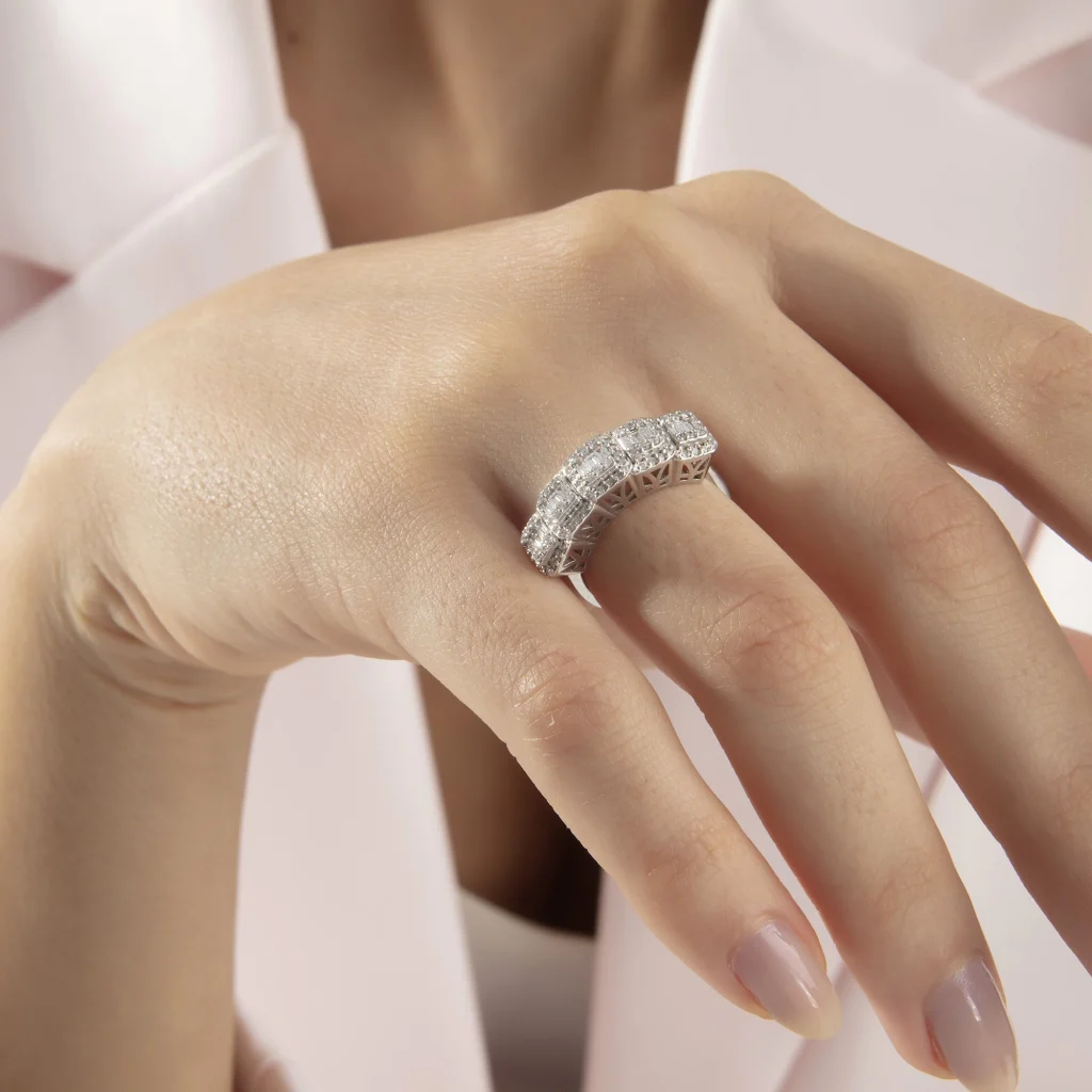 Bu tasarım klasik baget yüzüğün muhteşem ışıltısını beşe katlayarak, her ortamda dikkat çekici bir görünüm sunuyor. Yenilikçi ve sofistike bu yüzük sadece güzelliğinizi vurgulamakla kalmıyor aynı zamanda stilinizin iddialı ve zarif yönünü de ortaya koyuyor. Her bir pırlantanın ışıltısı, eşsiz bir estetik ve mükemmellik yaratıyor.