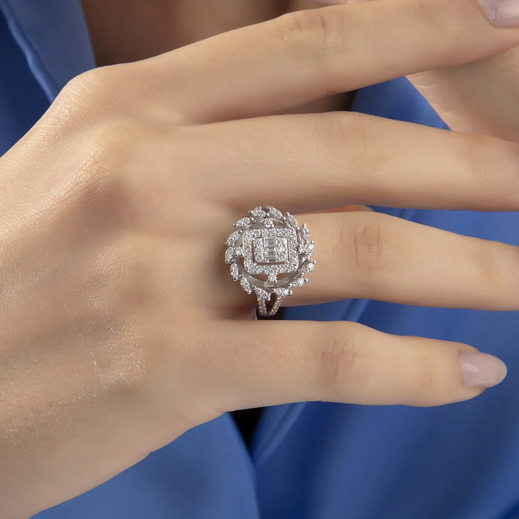 Bu özel tasarım pırlanta yüzük, sıradanlığın ötesinde bir güzelliği temsil ediyor. Lotus çiçeği esintileriyle bezenmiş bu mücevher, hem klasik hem de yenilikçi ruhu bir arada sunuyor. Merkezinde parıldayan baget pırlantalar klasiği temsil ederken, onları saran lotus yaprağı motifleri doğanın olağanüstü güzelliğini yansıtıyor. Yüzüğün kol kısmının her iki yanda ayrılması ise, klasik ve modern estetiğin mükemmel uyumunu barındırıyor.