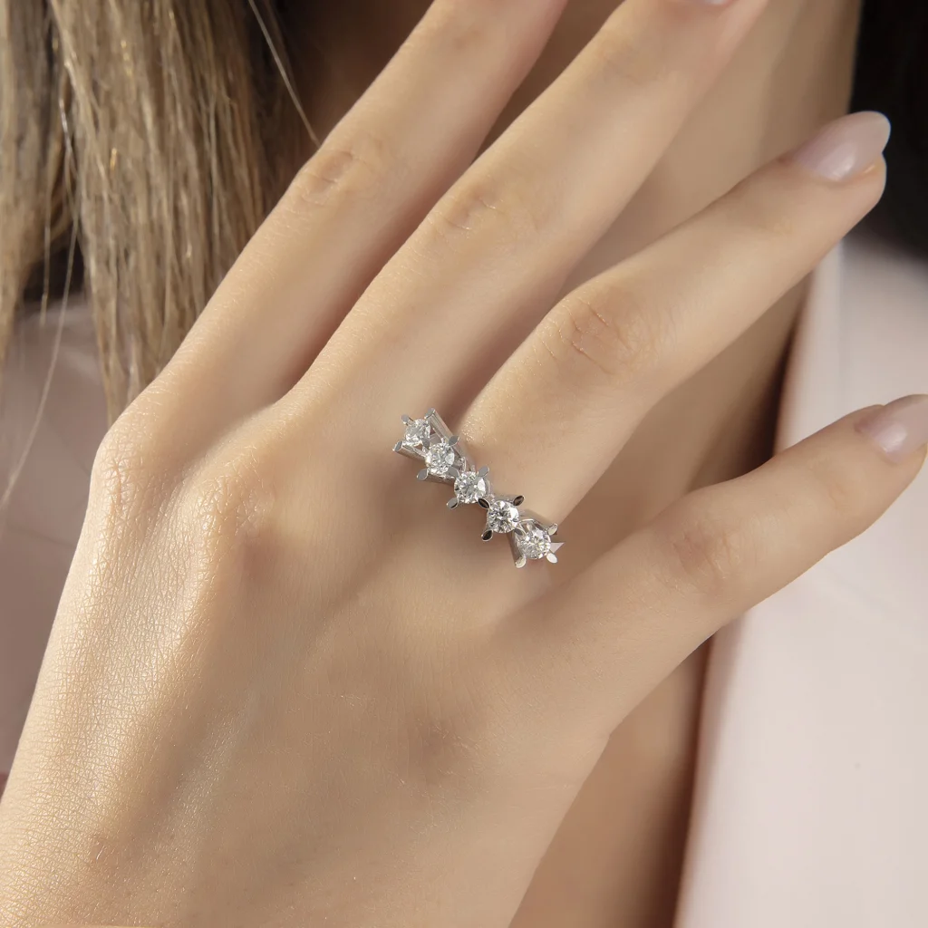 Her bir pırlanta, diğerine mükemmel bir uyum sağlamak için özenle seçilmiş ve yerleştirilmiştir. Bu uyum, yüzüğü takan kişinin parmakları boyunca ışıltıyla birleşen eşsiz bir bütünlük oluşturur.