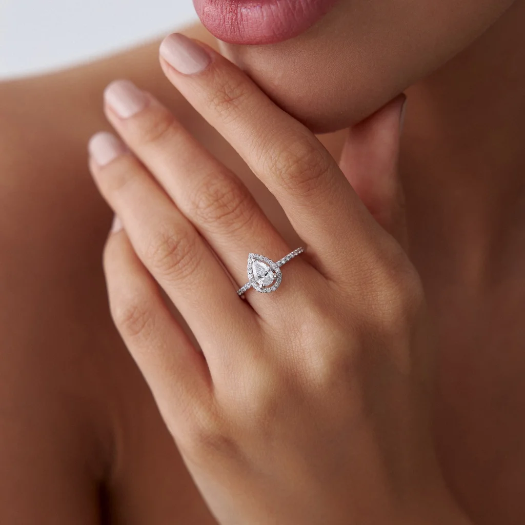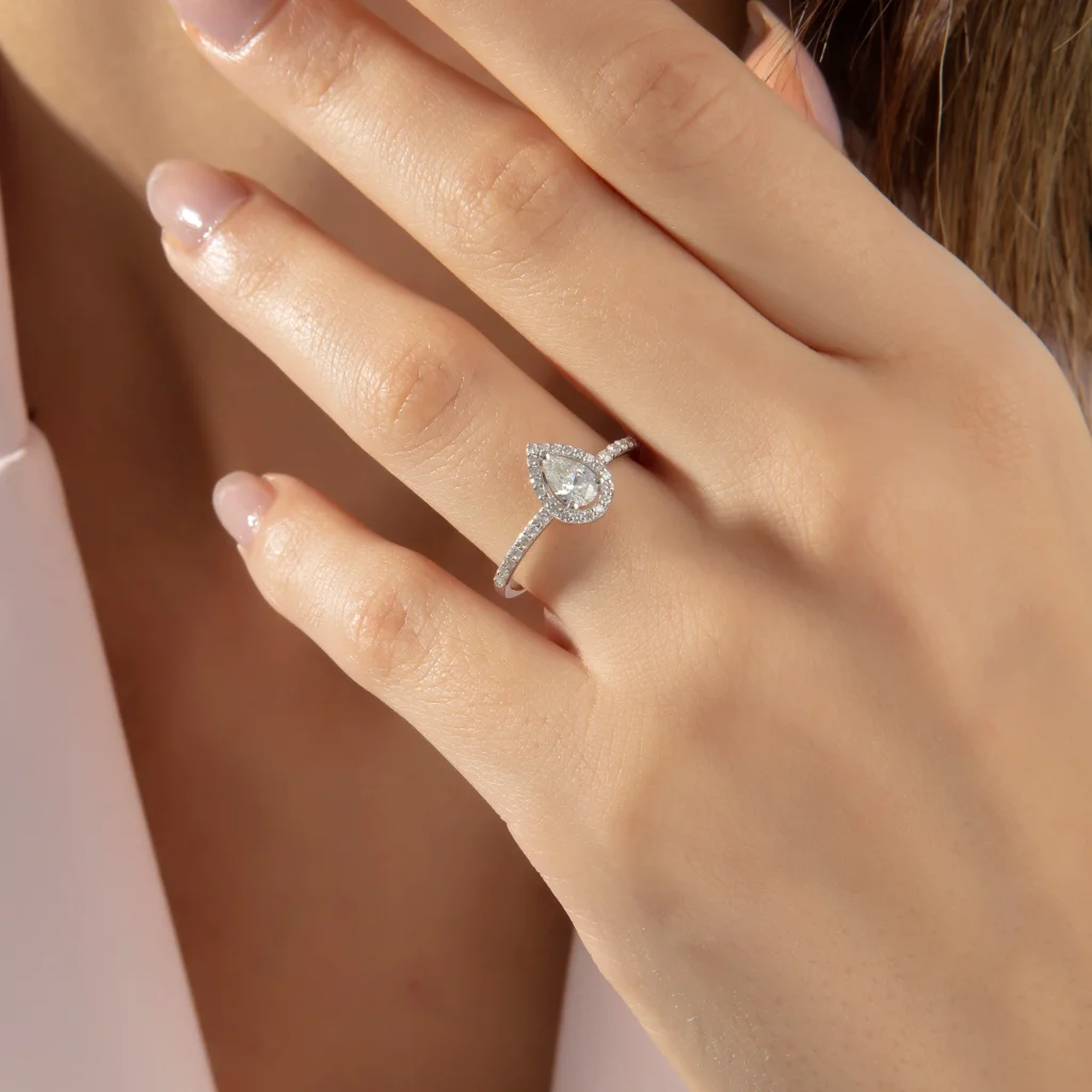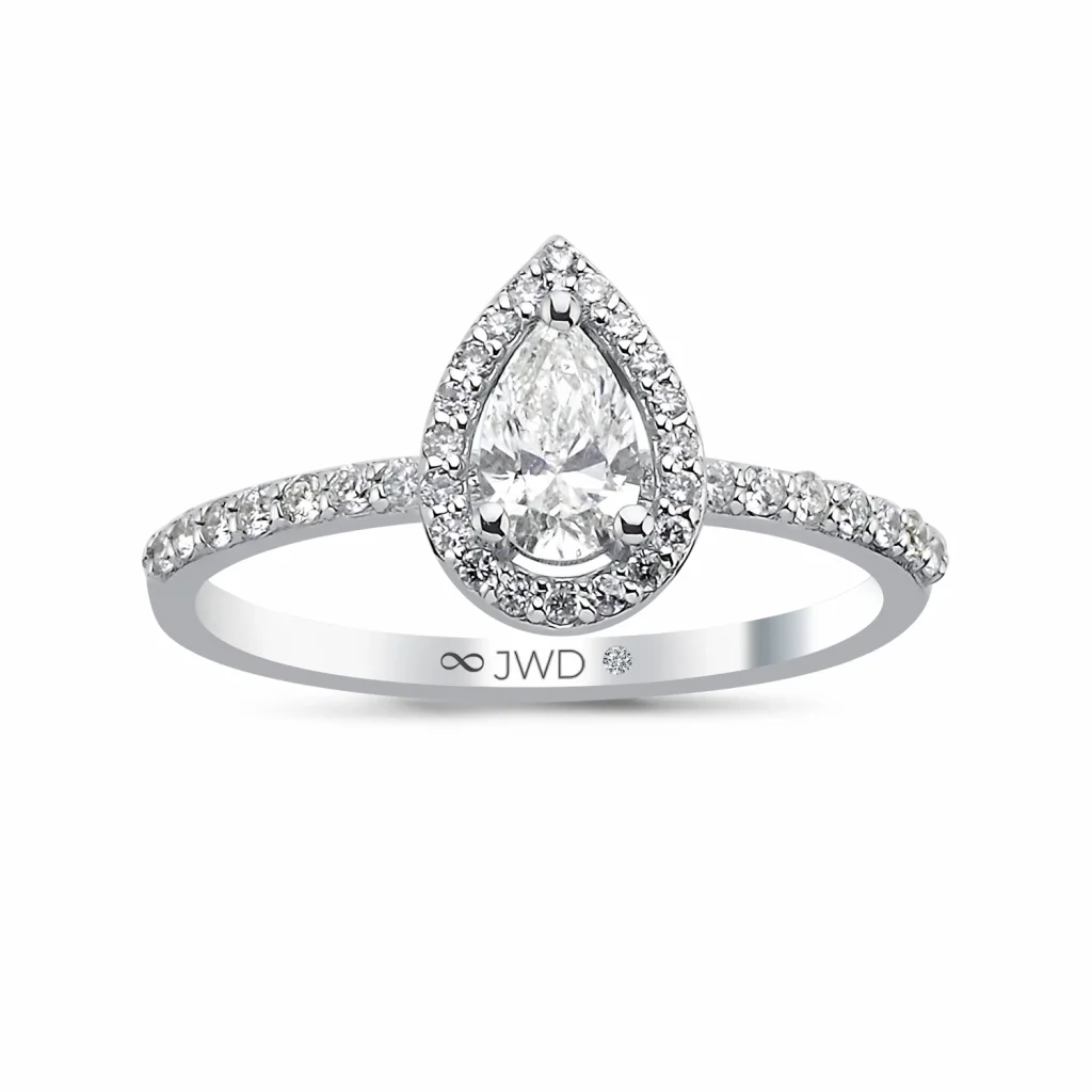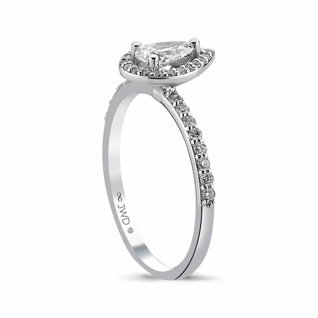 Bu benzersiz yüzük merkezindeki göz alıcı damla pırlanta ile ışıltısını taçlandırıyor. Damla pırlantanın etrafını saran round pırlantalar, zarafetini ve güzelliğini vurgularken, yüzüğün kolundaki pırlantalar ise merkezdeki ışıltının yanlara doğru zarif bir şekilde devam etmesini sağlıyor.