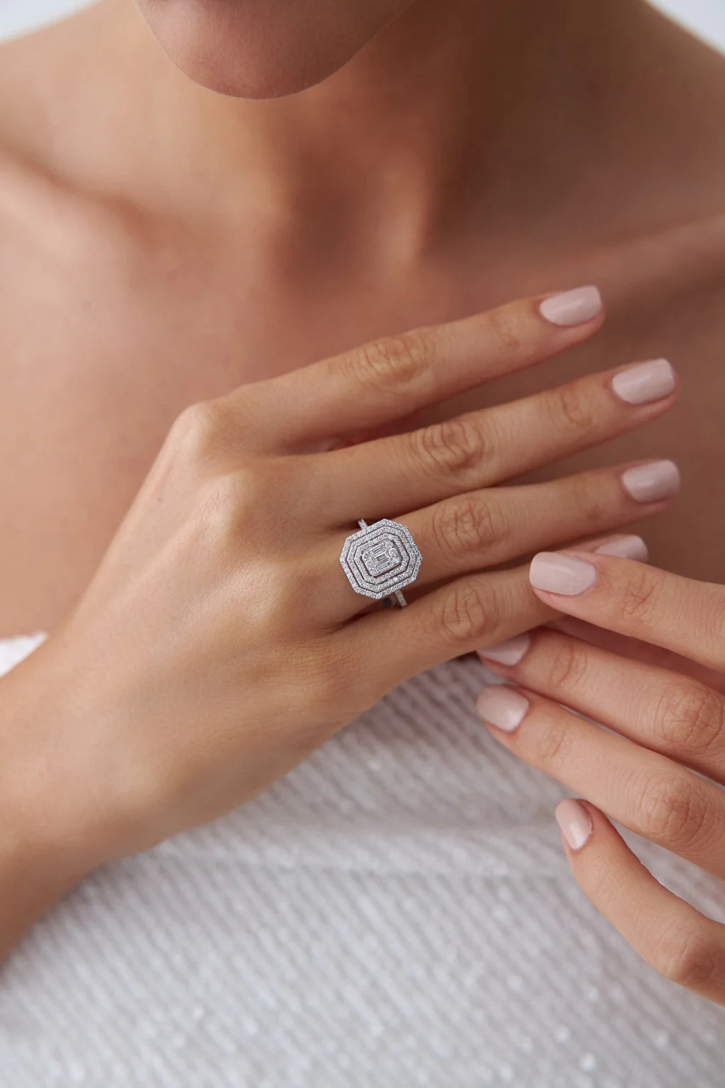 Merkezdeki pırlantaların muhteşem uyumu, bu yüzüğü taçlandırıyor. Her anınıza zarafet ve ışıltı katarken, etrafındaki üç sıra pırlanta detayı gösterişin tam anlamıyla dansını yansıtıyor.