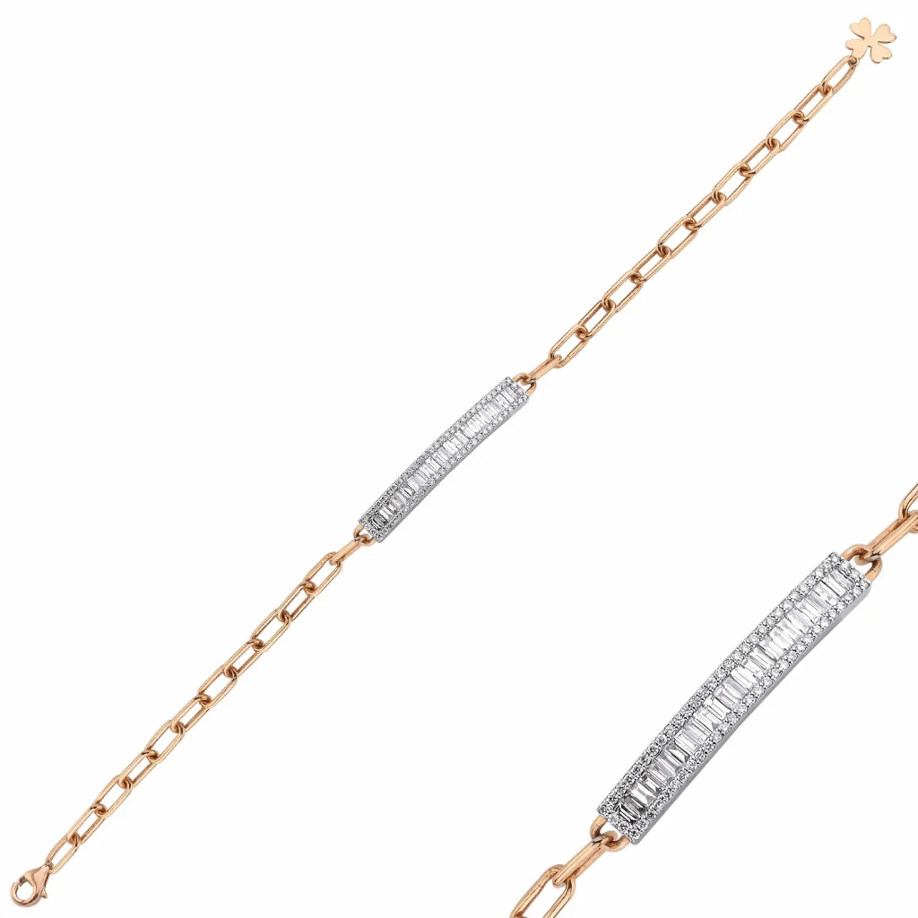 Baget pırlantaların özel yerleşimi, etrafını saran round pırlantalarla bir araya gelerek muazzam bir ışıltı yaratıyor. Bu bileklik her adımda farkınızı ortaya koyacak.