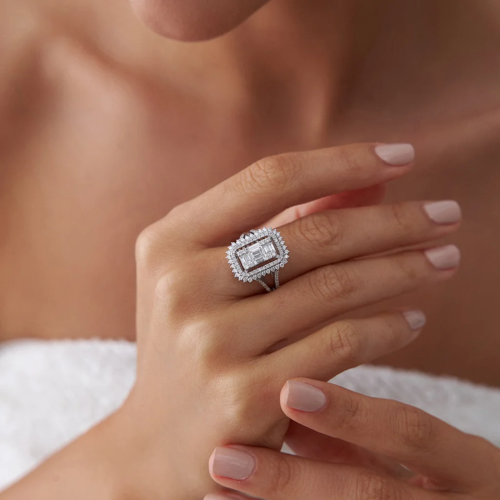 Bu yüzük merkezindeki akıllıca yerleştirilmiş baget taşlarıyla tam bir bütünlük içinde parlıyor. Her ayrıntıda aranan estetik uyumu hedefleyen kadınlar için özel olarak tasarlandı.