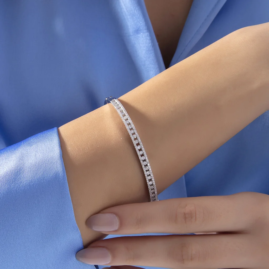 Zarafetin ve ışıltının muhteşem bir buluşması! 1.28 ct Pırlanta Kelepçe, en dışta özenle seçilmiş pırlantaların parıltısıyla başlıyor ve ortadaki aralıklarla dizilmiş pırlantalarla zenginleşiyor. Bu kelepçe, göz alıcılığı arayan kadınlar için tasarlanmış, eşsiz bir parıltıya sahip.