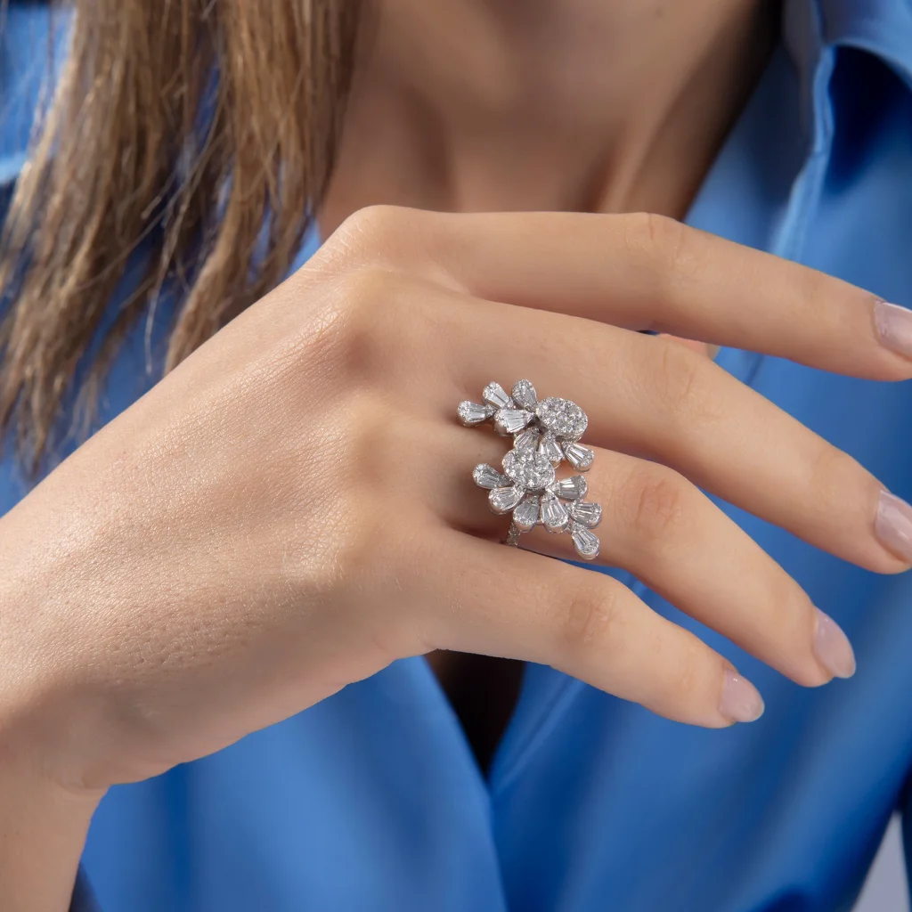 Bu özel tasarımlı yüzük, tarzını güçlü ve kendine has bir şekilde ifade etmeyi seven kadınlar için ideal bir seçim. Işıltısını birbirine yan yana konumlandırılmış round pırlantaların yarattığı oval pırlanta görüntüden alan bu mücevher, adeta göz kamaştırıcı bir şıklık sunuyor. Yüzüğün zarif tasarımı, baget pırlantalarla oluşturulmuş damla motifleriyle birleşip benzersiz ve etkileyici bir görünüm kazandırıyor. Tasarım modern ve sofistike çizgileriyle dikkat çekip kişiye kendine güvenen ve cesur bir hava katıyor. Eşsiz bir parıltıya sahip bu yüzük özgün tasarımı ve zarafetiyle her ortamda fark edilir bir stil yaratmanızı sağlayacak.