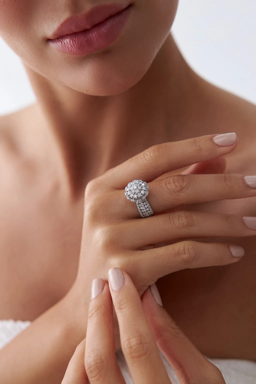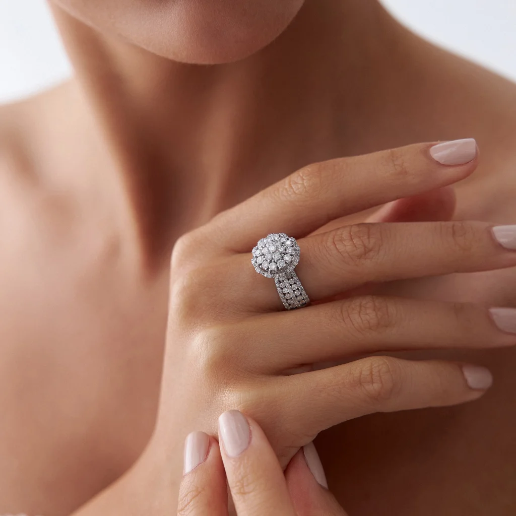 Yüzüğün merkezindeki büyük round kesim pırlantalar muazzam bir ışıltı sunarak bakışları üzerine çekiyor. Bu dizilim yüzüğe benzersiz bir parlaklık katarken tasarımın merkezindeki odak noktasını oluşturuyor.