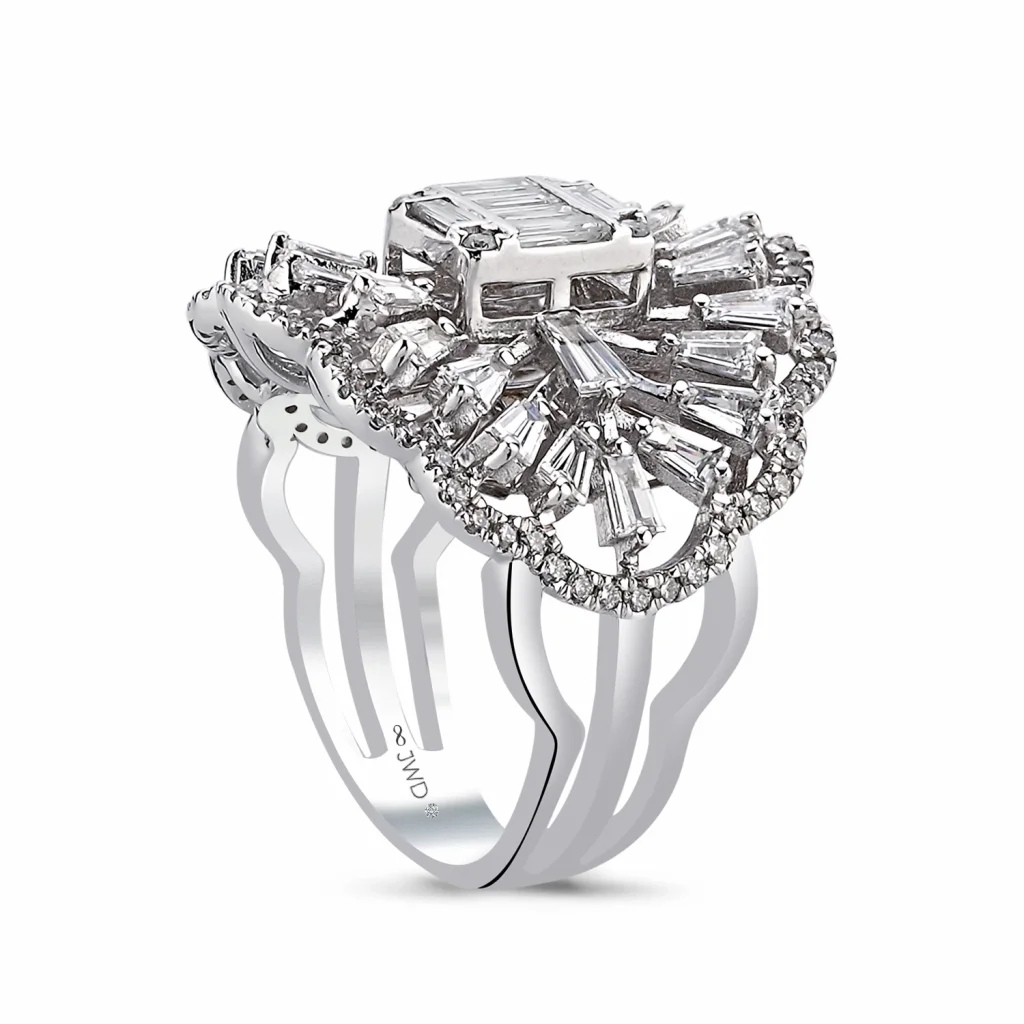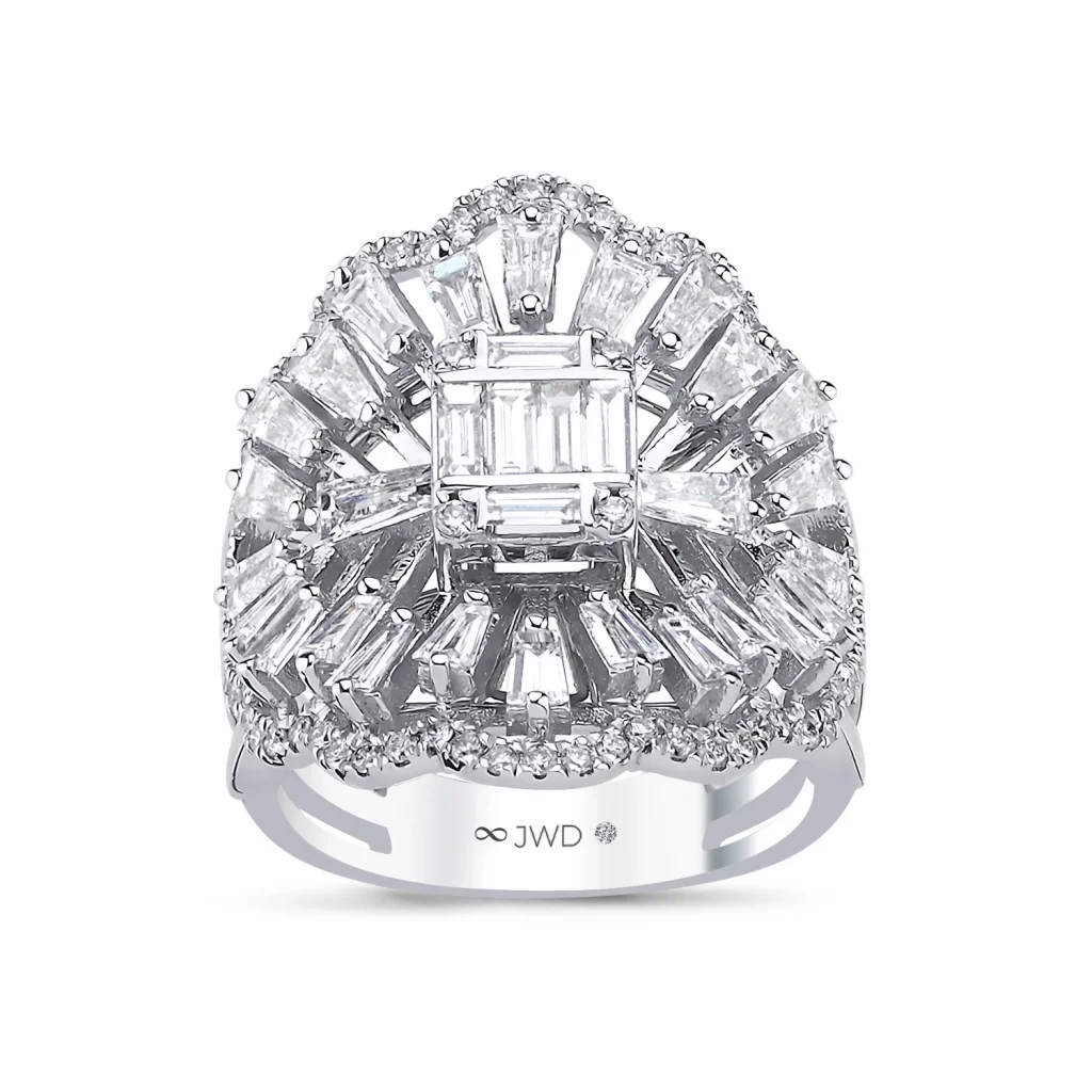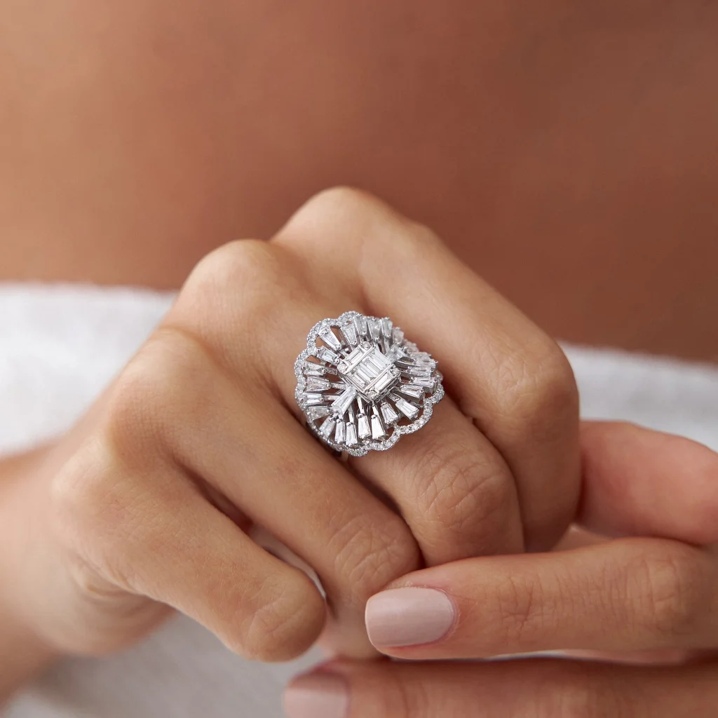 Baget trapez ve round kesimli taşlar, yüzüğü çeşitli ve zarif bir biçimde süsleyerek göz alıcı bir etki yaratıyor